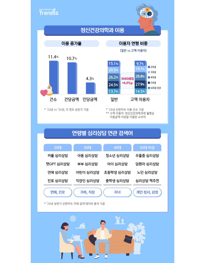한편 치열한 경쟁환경 속에서 ‘마음건강’을 챙기는 사람들의 모습도 데이터 분석을 통해 확인할 수 있었다. 신한카드 빅데이터연구소에 따르면, 2025년 상반기 정신건강의학과 이용 건수는 2023년 같은 기간 대비 11.4% 늘어난 걸로 나타났다. ‘심리 상담’에 대한 세대별 연관 검색어를 보면, 20대는 ‘진로’, ‘연애’에 대한 관심이 높았고, 30대는 ‘아동’, ‘부부’, ‘직장’ 등의 언급이 많았다. 40대에서는 ‘청소년 심리 상담’에 대한 내용이 주를 이루는 걸로 나타나 사춘기 자녀를 둔 부모 세대의 고민을 엿볼 수 있었다. 50대 이상은 ‘우울증’, ‘무력감’ 등 개인의 정서와 감정을 적극적으로 관리하려는 모습을 보였다.